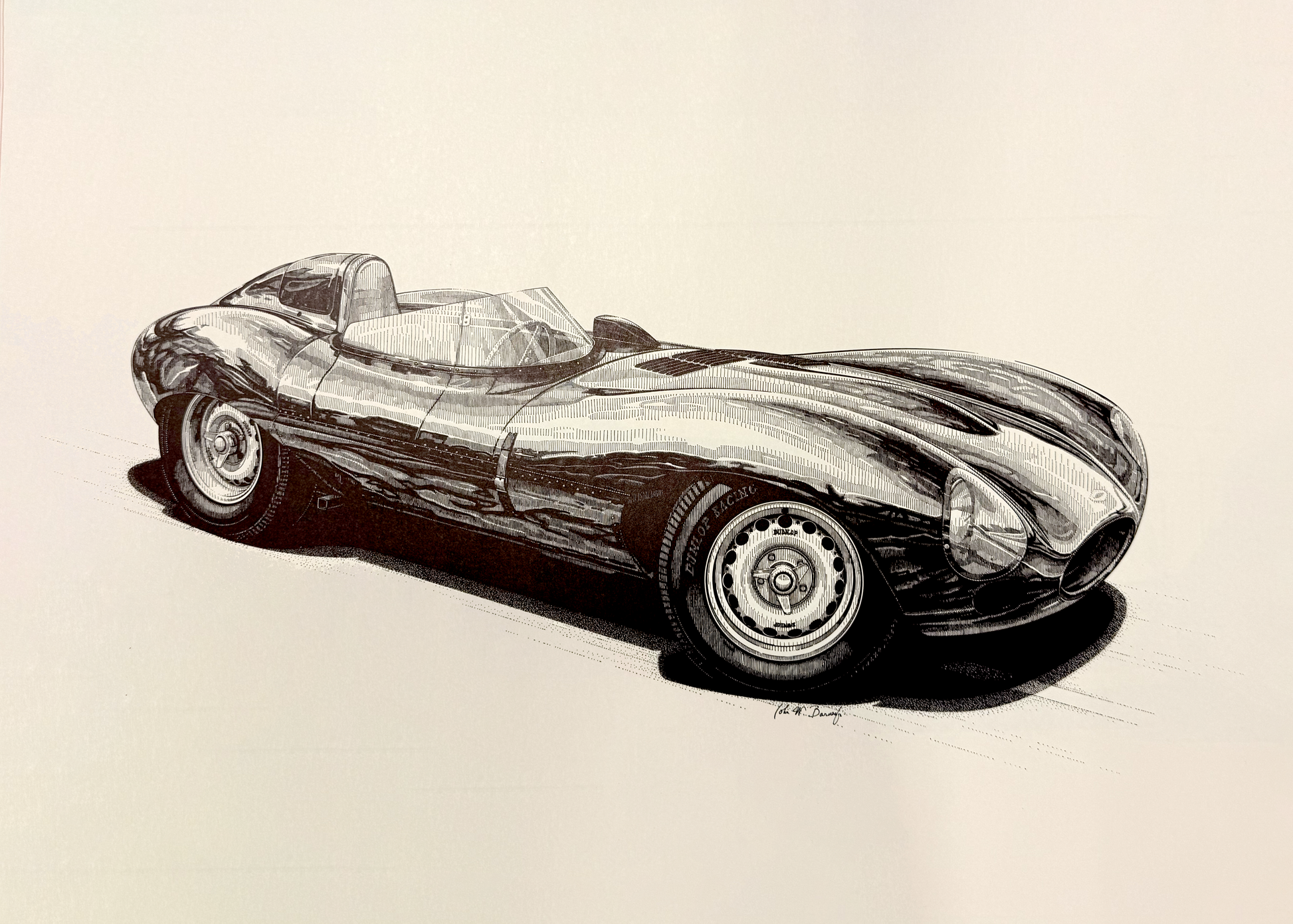 1970 Jaguar D-Type - Original Pen & Ink Drawing by John W. Barnes, Jr.